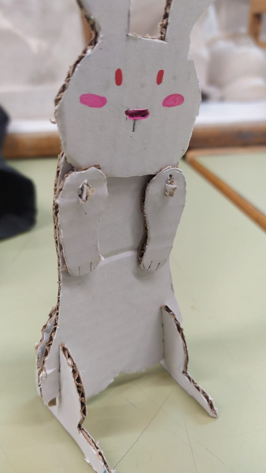 Una vez tuve todas las piezas en papel me dediqué a cortar el cartón y montarlo, haciendo algunos cambios de diseño como embellecer los enlaces por detrás dándoles cierta tridimensionalidad con el cuerpo del animal y cambiando el diseño de las patas para conseguir que se mantuviese en pie